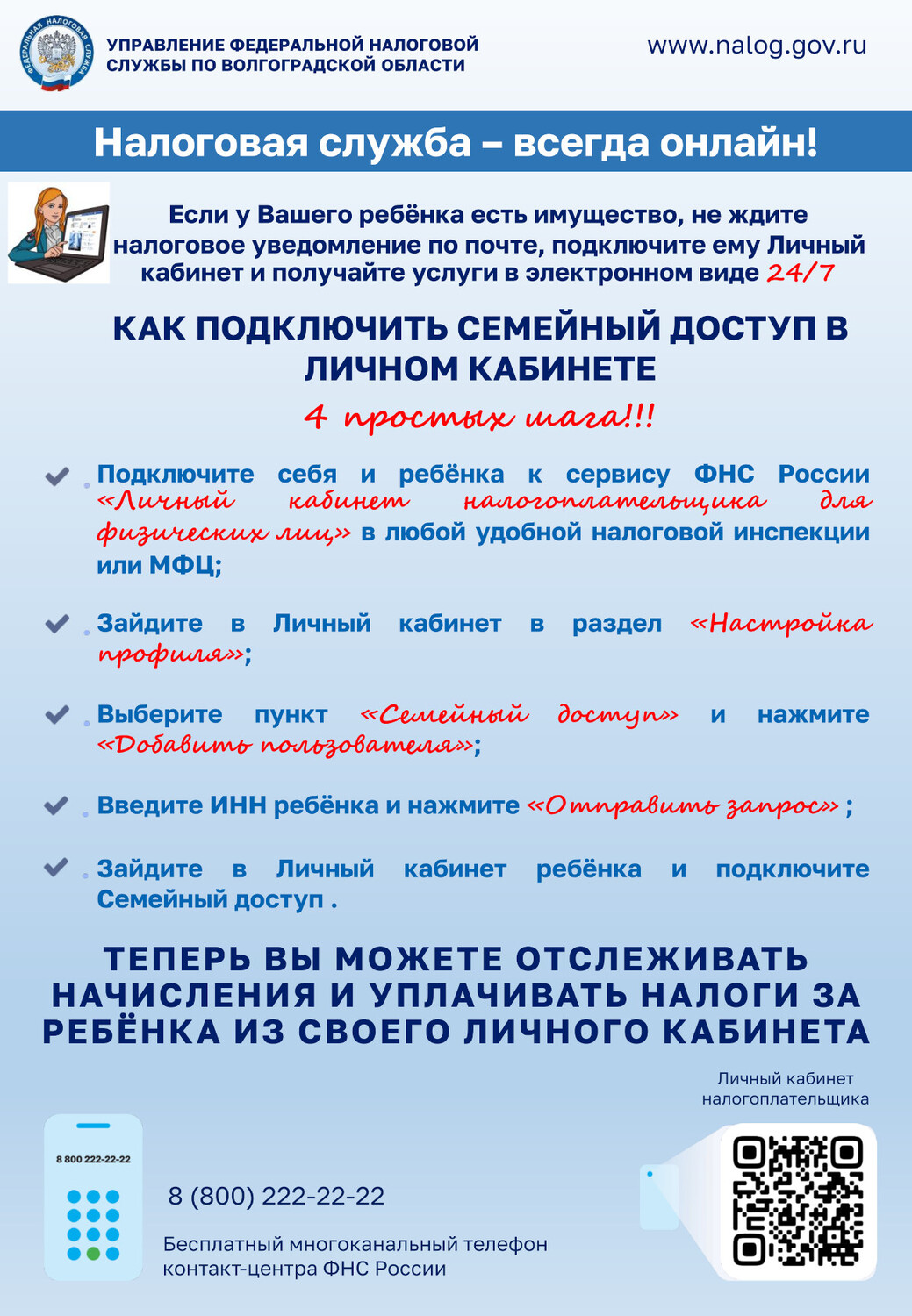 Родители (усыновители, опекуны, попечители) могут подключить своих детей к Личному кабинету: